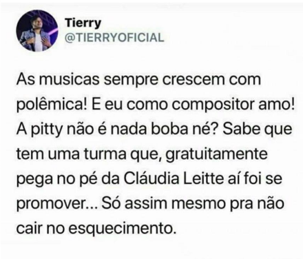 Bahia Notícias Holofote Notícia Após Polêmica Tierry Defende https://www.bahianoticias.com.br/holofote/noticia/49529-apos-polemica-tierry-defende-claudia-e-ataca-pitty-so-assim-pra-nao-cair-no-esquecimento.html